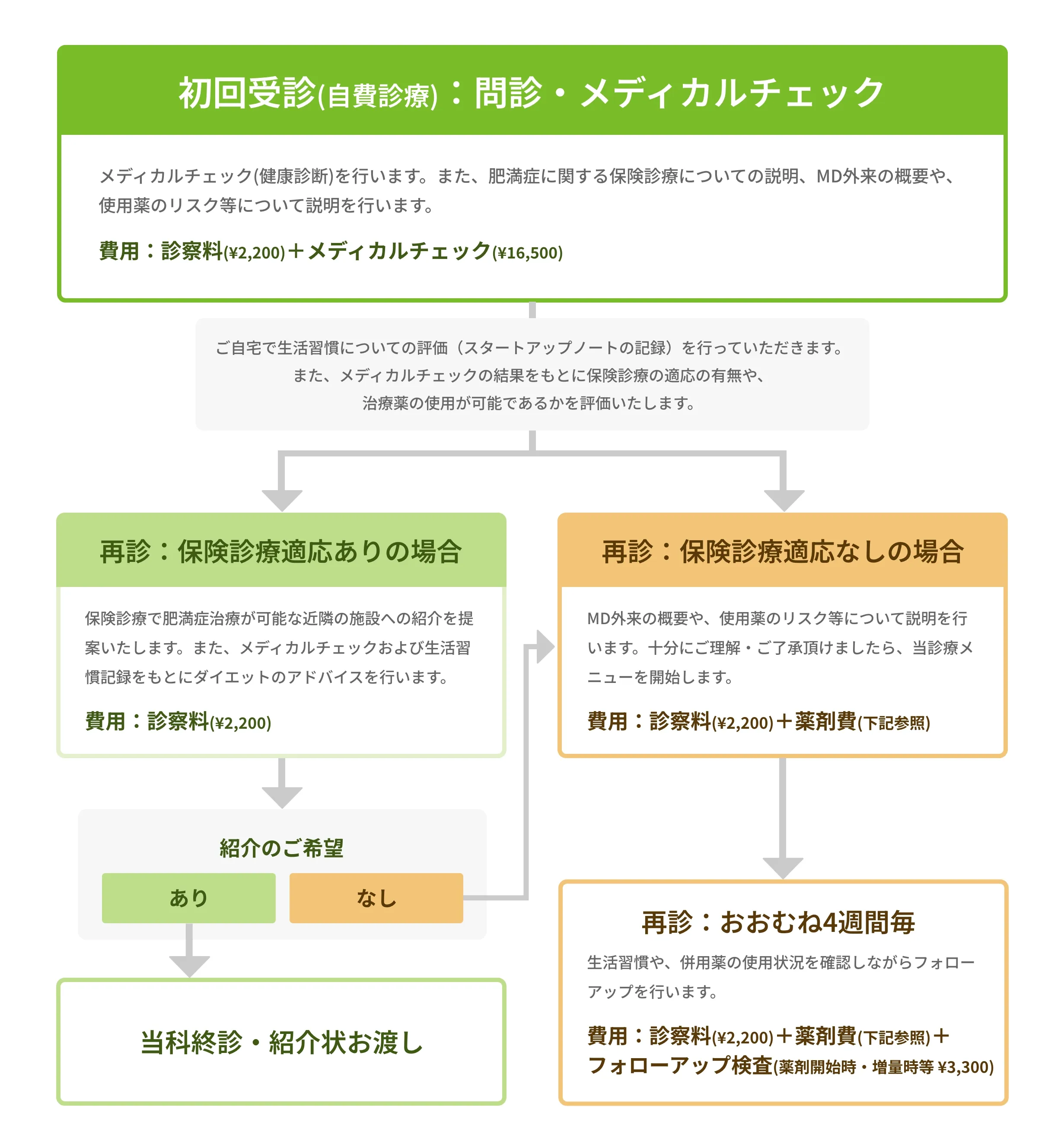 初回のメディカルチェックで保険診療(肥満症)の適応があれば、肥満症治療が可能である施設を紹介いたします。本外来の目的はあくまで「ダイエットによる健康の達成」ですので、BMI[ 体重(kg)÷身長(m)2 ]≧25(kg/m2)以上の方のみが対象です。